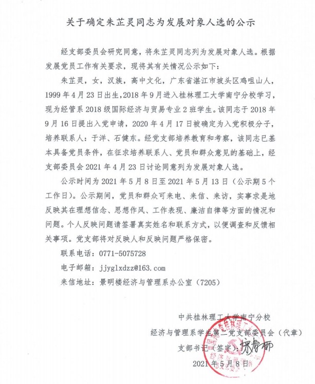 经济与管理系学生第二党支部关于确定朱芷灵同志为发展对象入选的公示