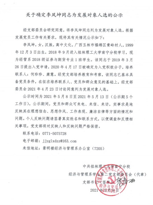经济与管理系学生第二党支部关于确定李凤坤同志为发展对象入选的公示