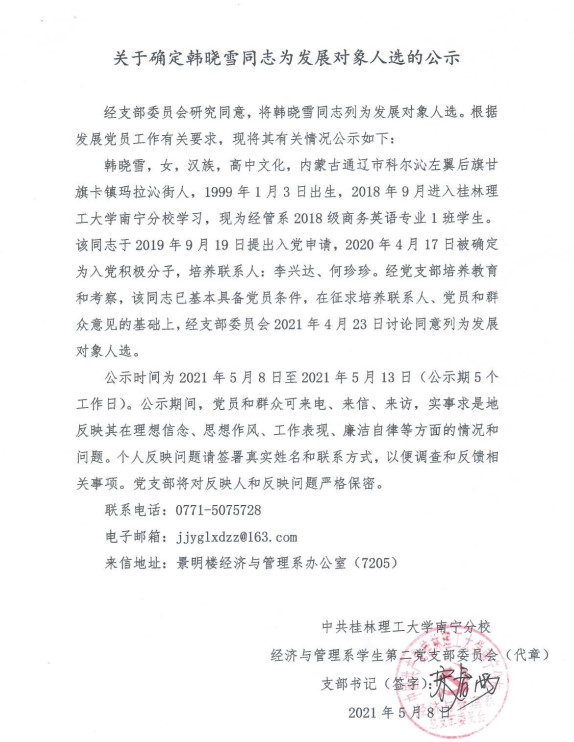 经济与管理系学生第二党支部关于确定韩晓雪同志为发展对象入选的公示