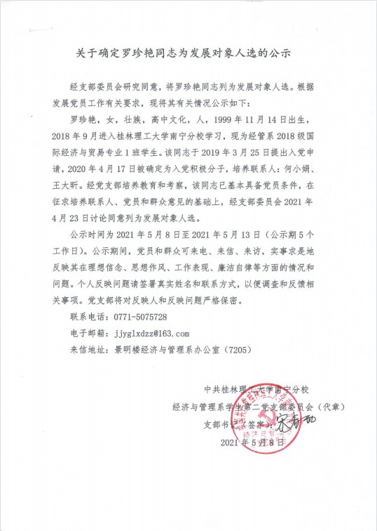 经济与管理系学生第二党支部关于确定罗珍艳同志为发展对象入选的公示