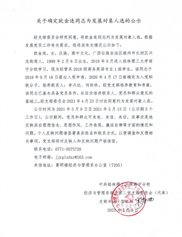 经济与管理系学生第二党支部关于确定欧金连同志为发展对象入选的公示