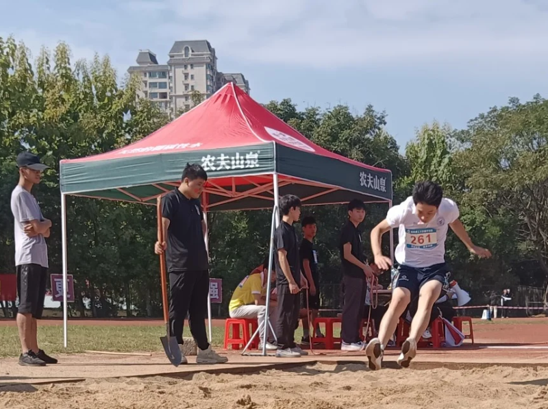田径场上的运动员们摩拳擦掌,如火的运动热情更胜炎热气温。看,我系运动员目视前方,眼神坚定自信,起身快速起跳,迈出有力一步,粉色的身影翩然似轻燕,而后稳健落地。最终,童一帆以6.09米的好成绩将冠军揽入囊中。