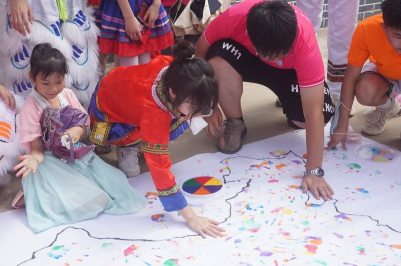 手拉手结队,青年党员团员和少先队员一对一结对,互相交换卡片和精心准备的礼物,看着少先队员们开心的笑容别样温暖;民族团结才艺展示,“山对山来,崖对崖,蜜蜂采花深山里来···”我系一曲《弥渡山歌》以欢乐活跃的舞姿作为第一个节目出场;民族团结趣味活动交流、青年党员团员带领少先队员在中国地图上按手印,颜料粘在手上,党员团员和少先队员一齐按下,此刻默契是日后的陪伴;民族团结共植石榴树,种下石榴树,代表各民族就要像石榴籽那样紧紧抱在一起,民族团结是一种精神,一种思想,一种追求,它对凝聚人心,整合力量,整合社会起着重要作用。老师带领一起种下石榴树。