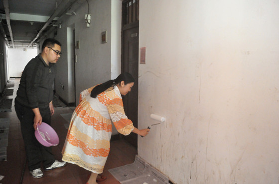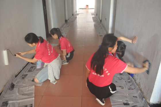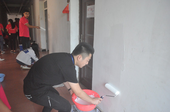向同学们发放刷墙工具后,活动正式开始。为美化墙角,使宿舍墙壁焕然一新,同学们分工合作,明确自身工作,各自完成清理墙壁上的污渍和粉刷墙壁的任务。在同学们不怕苦不怕累的艰苦劳作下,三楼一角的墙壁重新恢复了整洁干净的面貌,同学和老师们顺利完成了此次宿舍环境美化活动。即使其中的过程很辛苦,却掩盖不住同学和老师们对成果的喜悦。