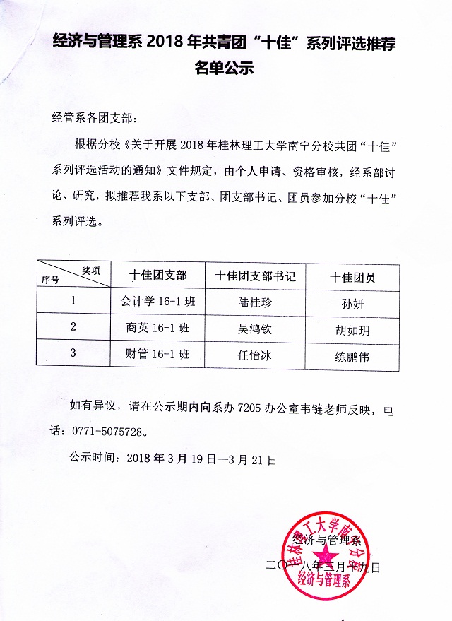 经济与管理系2018年共青团“十佳”系列评选推荐名单公示