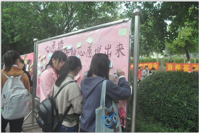 本次女生节活动以个人形式参加,共设心愿墙许愿、“T”台走秀、编发大赛、快叠快穿等趣味比赛。心愿墙许愿活动中,同学们纷纷在五彩缤纷的便利贴纸上许下心愿,送上祝福。一张张飞舞的便利贴承载着的心愿翩翩飞舞,成为桂工的一道亮丽的风景线;“T”台走秀中,姑娘们穿着古香古色的汉服带我们一起感受中国风的韵味;编发大赛、快叠快穿等活动精彩纷呈,现场一片欢声笑语。
