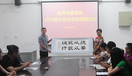 最后,为了感谢母校的栽培,毕业班党员席典鹏代表2016届毕业生党员向母校捐赠了一幅书法作品。