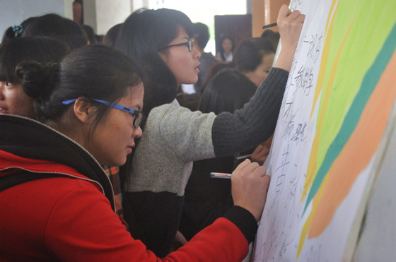 3月24日下午,我系壹心社公益组织牵头,组织发动全体受资助的同学,在空港校区启智楼201教室,召开学风建设推动大会。我系党总支书记梁勤、副书记黄薇薇与全体辅导员老师参加了大会。大会上,全体受助人员郑重宣誓,表示自愿加入到学风建设集体队伍,自觉遵守学校各项规章制度,在学习上夯实基础,博学笃志,在纪律上以德为备,严以律己,在卫生上窗明几净,一尘不染。学生在宣传横幅上签名,承诺不辜负党和国家的资助,努力学习,回报社会。