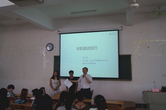 5月19日下午,我系在空港校区启智楼203教室举行求职面试技巧讲座。南宁市企星企业管理咨询有限公司咨询师、培训师周长明应邀主讲,我系2013级毕业生、部分2014级学生共250余人聆听了讲座。
