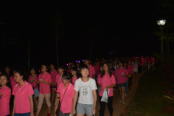 在活动现场,师生们手拿荧光棒,头带各种荧光头饰,由学校正门-慧智园-秀雅园-轩宇楼-逸群楼-俊逸楼-青工楼-明德路-田径场这一路线夜行。一路谈笑风生,一路休闲漫步,师生们在融洽的气氛中一起体验健康的步行乐趣。