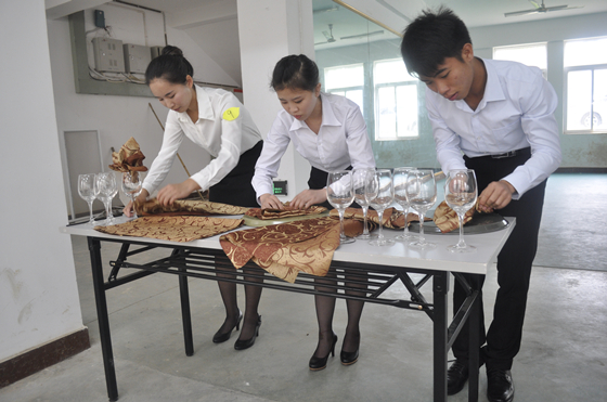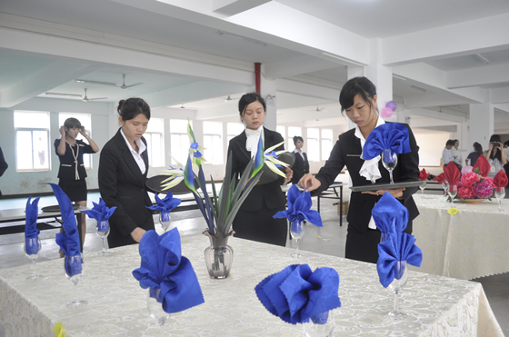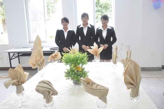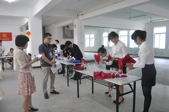 本次比赛旨在考核学生的餐花设计技能,检验酒店管理专业学生的仪容仪表仪态是否符合酒店餐饮从业人员的标准。比赛以团体方式参加竞赛,要求每个参赛团体成员为3人,团体的成员分工合作,相互配合,在6分钟内,用餐巾折出10种不同造型的杯花,包括5种植物和5种动物。