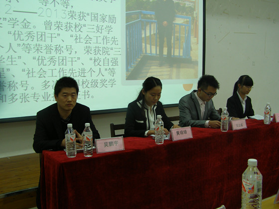 随后,四位优秀学生党员代表们结合自己的成长经历,用真实的事例与2013级新同学分享了自己的动人故事。“就业先锋”吴鹏宇告诉我们如何在求职中坚定自己的信仰与追求;“英语达人”黄培培教会我们如何在学业上取得优异成绩、“文艺典型”吴志威告诉我们如何在活动中收获成长、“学习标兵”马淑娴分享了她如何在生活中、在学习上锻炼成才的动人故事。他们结合自己的亲身经历,讲述了各自平凡生活中不平凡的生活态度和人生追求,向广大学生展示了当代优秀大学生的良好形象。