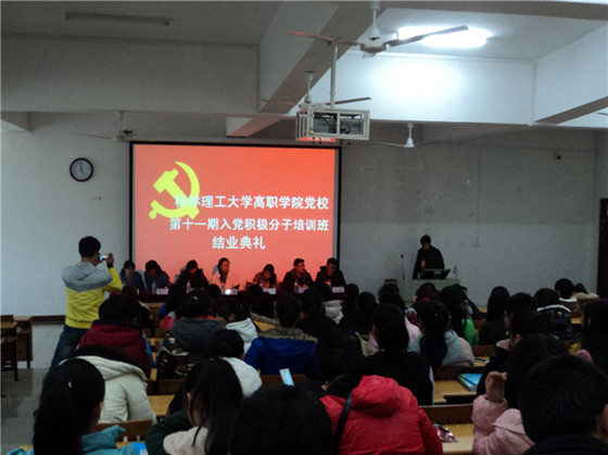 2013年12月17日下午5时,我系在启智楼301教室举行第十一期入党积极分子培训班结业典礼。学院党委办公室副主任苏欣、我系党总支书记梁勤,党总支副书记黄薇薇等领导出席了典礼现场,我系第十一期入党积极分子共154人参加了结业典礼。