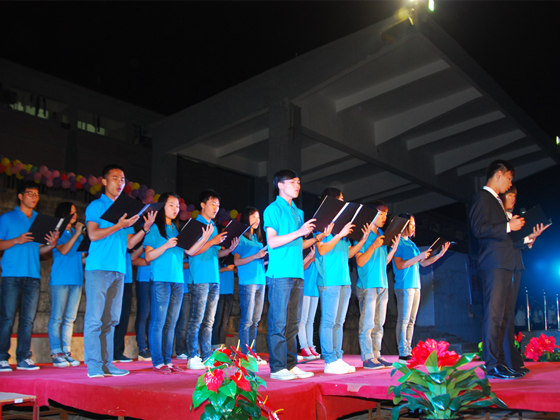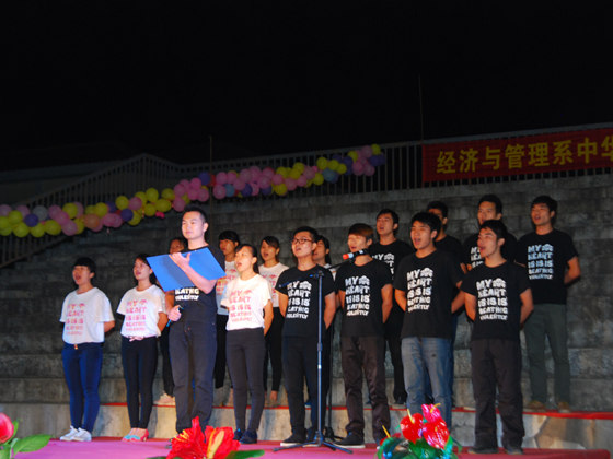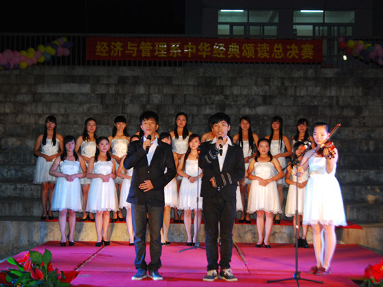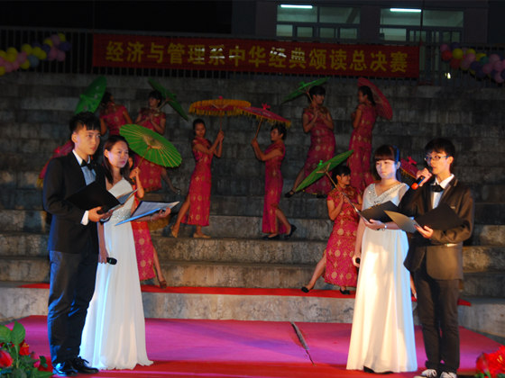 为营造富有激情的校园文化氛围,推动校园文化建设,展现当代大学生风采,提高大学生的人文素质和道德情操,2013年10月24日晚7时,我系在足球场举行中华经典诵读比赛总决赛。出席本次活动的领导嘉宾有我系党总支书记梁勤,党总支副书记兼学工组长黄薇薇。各班辅导员老师和2013级全体学生一起观看了比赛。