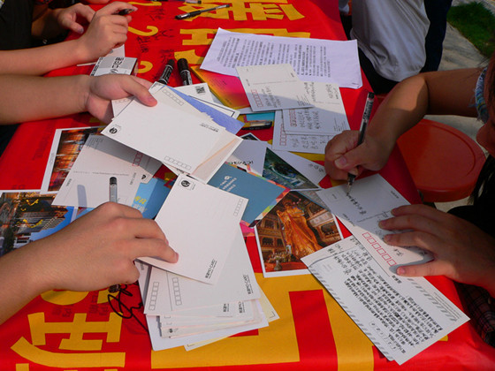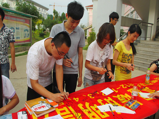 此次活动内容主要有两项,一是收集明信片寄语,活动过程中,络绎不绝的大学生驻足留言,给灾区小朋友寄去问候和安慰,最后收集到的220张明信片将通过信使把我们的祝福送到灾区小朋友的手中。二是祝福签名。同学们积极在横幅上签名,寄托了我们对灾区重建家园的殷切希望。