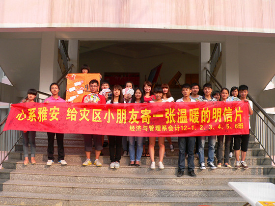 2013年5月20日我系会计专业12级1-6 的同学在桂林理工大学南宁空港校区的食堂门口举办了“心系雅安,给灾区小朋友寄一张温暖的明信片”的公益活动,拉近了大学生与灾区小朋友们的距离。