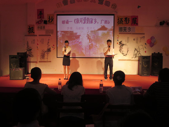 晚会在陶姣姣的朗诵《壮乡,我来这里歌唱》中拉开序幕。歌曲《康美之恋》、舞蹈《壮族舞》等一系列精彩叫好的文艺表演将晚会推向了高潮,而许枫老师和黄维老师带来的歌曲串烧更是晚会的一大亮点。壮乡文艺晚会为我系读书节系列活动画上了一个圆满的句号。