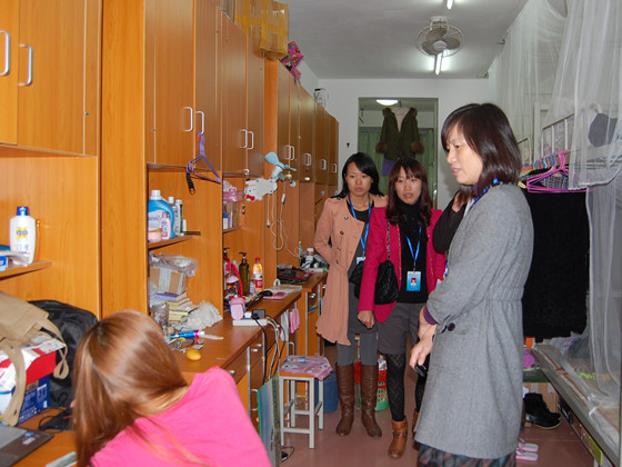2012年12月6日晚21点30分,在我系学工组长廖秋凉老师的带领下,学工老师陈平东、张川、农丽燕,以及我系团总支学生会副主席冀晓静一行走访了女生宿舍,就同学们近期较为关心的问题进行了诚挚的交谈。