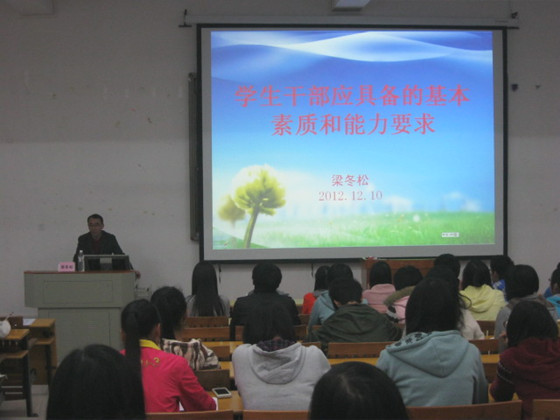 为提高我系学生干部的业务水平和理论水平,我系于2012年12月10日至14日举行2012年秋季学期学生干部培训班。10日晚,继培训班开班仪式结束后,高职学院党委副书记梁冬松为我系学生干部讲了第一课,他主讲的题目是《学生干部需具备的基本素质及能力要求》。系团总支学生会以及各班班长、团支书等共200余人聆听了培训课程。