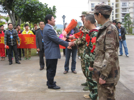 高职学院院长刘宝臣亲手为新兵送上鲜花