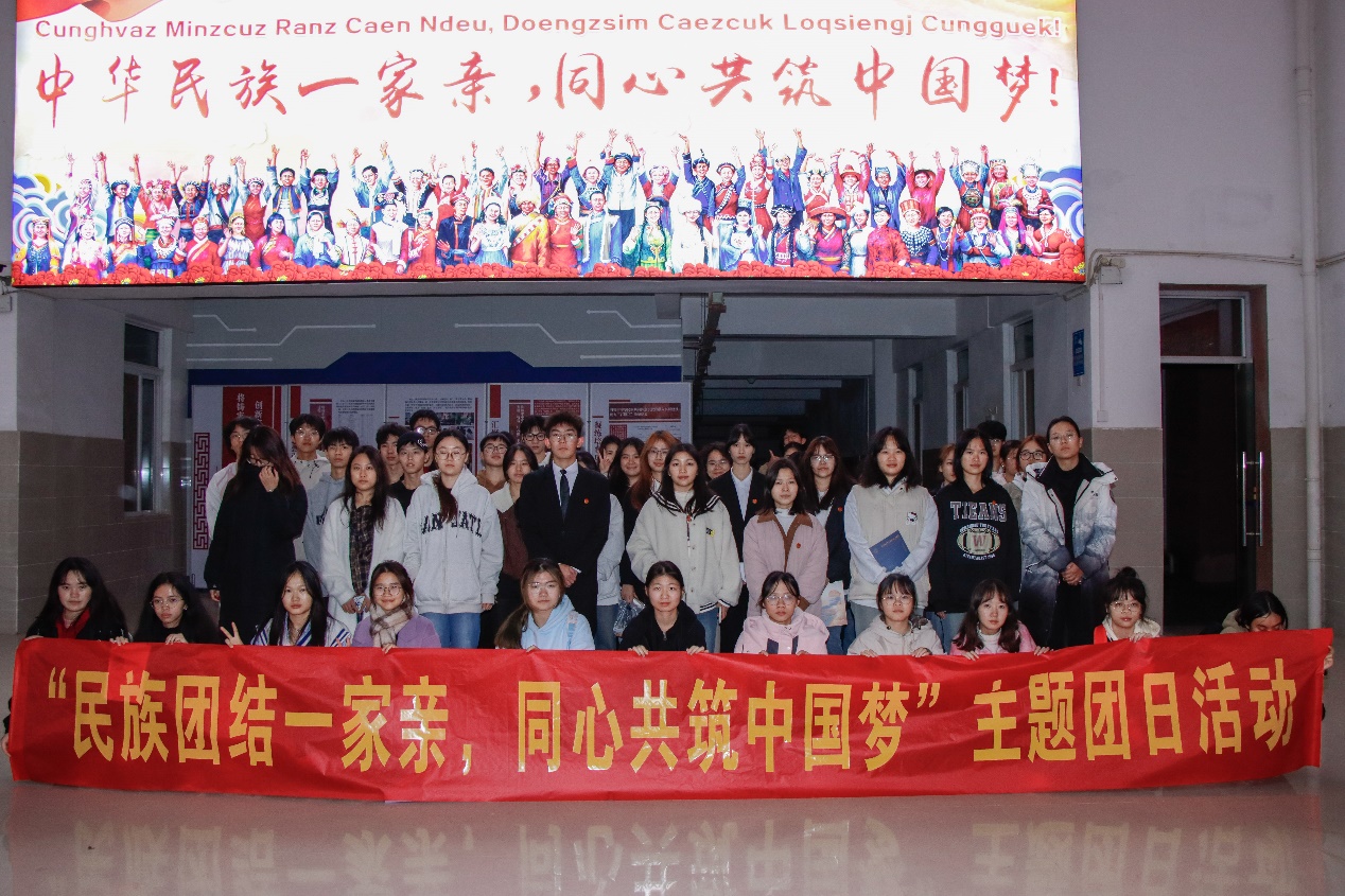活动在庄严的团歌中拉开帷幕,接着班级团支书李加庭在发言中号召青年学生:要坚决地维护祖国统一和民族团结,从日常的一点一滴做起,与来自不同民族的同学打好交道,尊重各民族文化;作为共青团员,是党的后背主力军,要发挥好先锋模范作用,投身于民族团结进步事业。本次活动通过团员代表发言,有奖知识竞答,参观桂南民俗博物馆等形式对“三个离不开”、“五个认同”、“六个相互”、“三个特别”的新时期民族团结共处内容进行了集中讲解学习,促进青年学生铸牢中华民族共同体意识,使各民族像石榴籽一样紧紧抱在一起,自觉做民族团结进步事业的建设者。