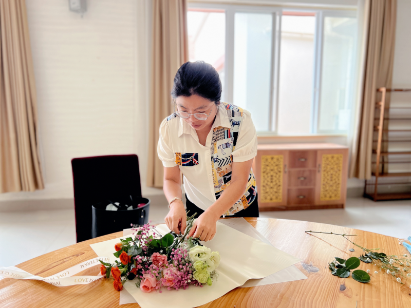 工会委员白永琴老师现场展示插花技巧