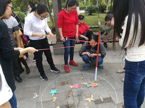 活动以小组竞赛的形式进行,共设有“钓鱼”、“游三园”、“木头人”等活动内容。活动中,竞赛的紧张与趣味相结合,老师们齐心协力,勇闯关卡,释放压力,身心愉悦;现场被加油呐喊和欢声笑语包围,弥漫着温馨、和谐的气氛。
