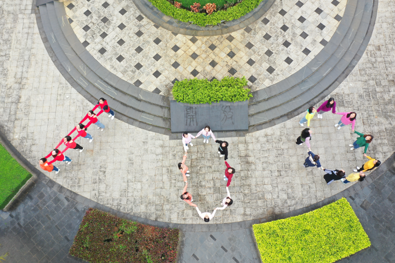 建党百年,巾帼献礼。我系分工会女教职工身着糖果色上衣,尽显教书育人的热情,摆“100”字样,凝聚巾帼之“她”力量,献礼建党100周年;紧跟时代步伐,心形中有党旗,党旗于心之中,尽展爱国,流露爱校,倾情爱岗。