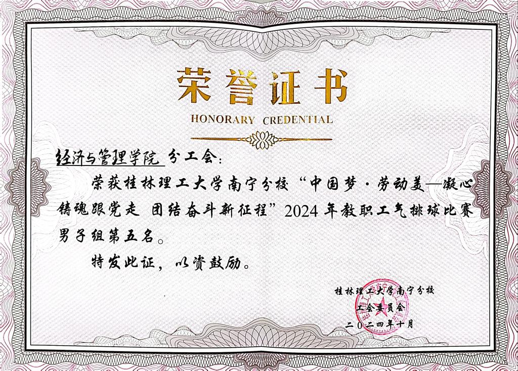 近日,经济与管理学院分工会在桂林理工大学英国上市公司365举办的“中国梦·劳动美—凝心铸魂跟党走 团结奋斗新征程”2024年教职工气排球比赛中,男子代表队表现出色,荣获男子组第五名的佳绩。
