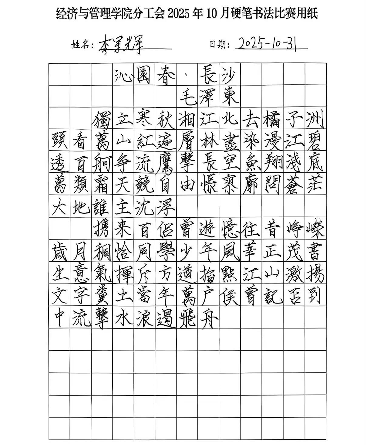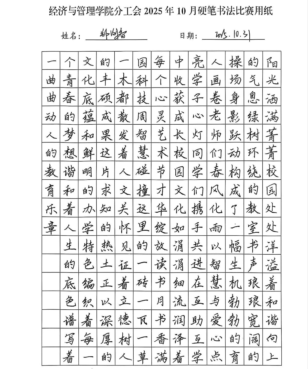 为丰富校园文化生活,激发教职工练字兴趣,增强文化自信,培养良好书写习惯,近日,经济与管理学院分工会开展“盛世金秋谱华章 奋进有为正当时”硬笔书法活动,全院教职工积极参与。