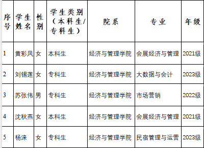 根据上级和学校有关文件要求,经济与管理学院2024年度筑梦奖学金院内推荐工作已经完成,经学生个人申请,班主任、辅导员推荐,学院评审小组研究,拟推荐学生5名。现将学院拟推荐名单公示如下,公示期为3天。