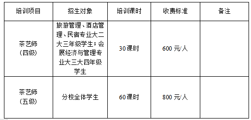 结合我学院实际情况,茶艺师可报名培训学生及相关培训收费标准具体如下:
