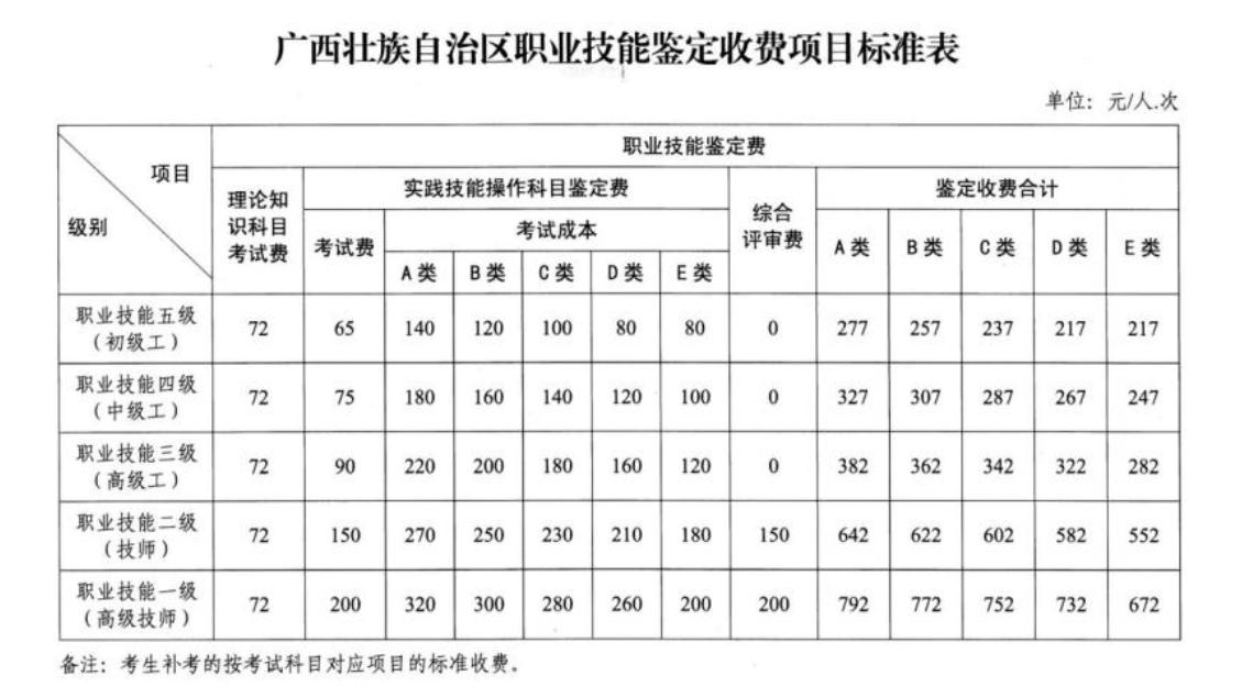 根据《广西壮族自治区职业技能鉴定职业(工种)分类表》、《广西壮族自治区职业技能鉴定收费项目标准表》文件规定,茶艺师为B类工种,四级、五级鉴定费分别为:307元、257元,收费标准如下: