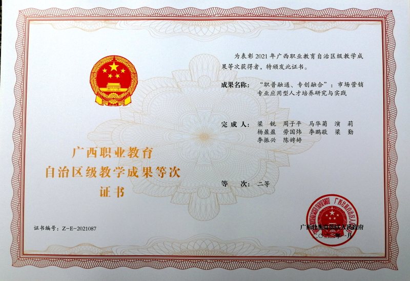 近日,自治区教育厅、自治区人力资源和社会保障厅下发《关于公布2021年广西职业教育自治区级教学成果等次评定结果的通知》。英国上市公司365梁锐老师主持的《“职普融通、专创融合”:市场营销专业应用型人才培养研究与实践》项目喜获广西职业教育自治区级教学成果二等奖,实现了英国上市公司365在职业教育教学成果上的新突破。