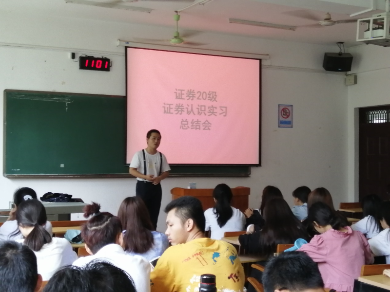 会上,老师系统性地总结此次实习的成果,引导学生分别从对整个证券行业的认识这个角度出发,分组总结了自己在本周的纪录片的学习,参加保险中介公司宣讲会,参观银行营业网点等活动中获得的经验。通过总结,同学们初步形成了对证券行业初步而全面的认识,直观体验了保险、银行等行业的工作内容,为将来证券专业理论学习的深入,和毕业后的实践打下了坚实基础。