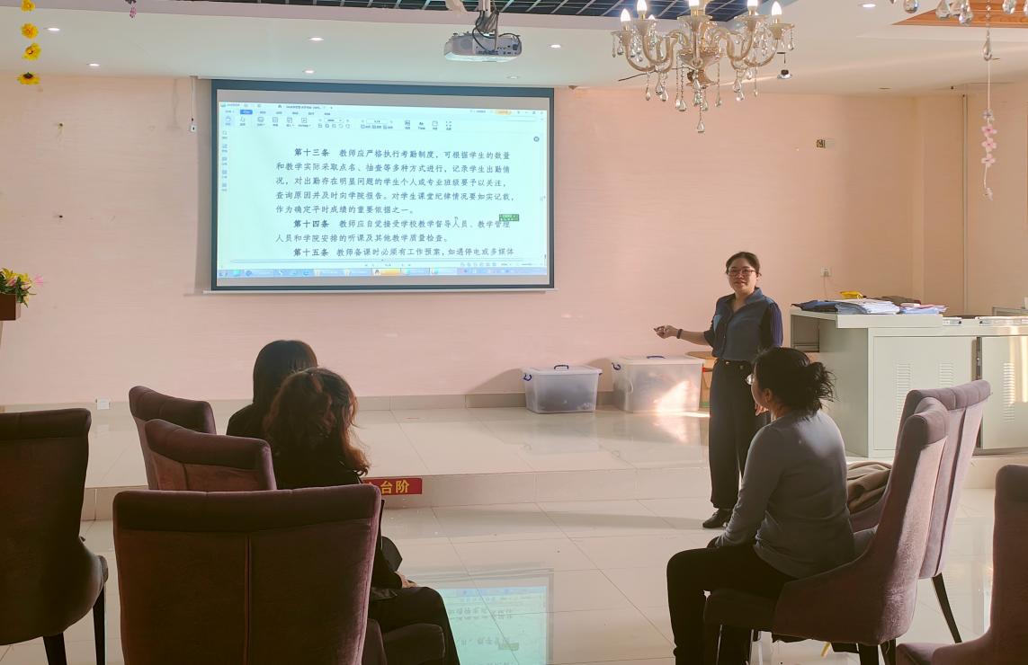 会议由酒店管理教研室主任李小红老师主持,对学校的教务管理部运行制度进行了全面而深入的解读。从学生学籍管理规定、教学工作规范、课堂管理规定到教研室工作管理条例等多个维度,详细阐述了制度的核心要点,深化了教师们对学校教务各项管理制度的理解。