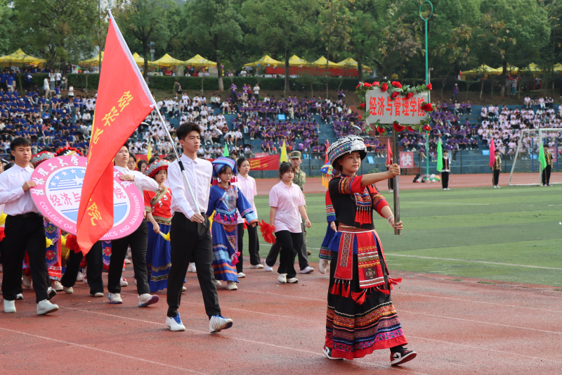 在第四届民族运动会开幕式表演环节,经管学院方块队为观众呈现了以“五颜六色绘锦绣,同绘祖国富强图”为主题的民族舞表演,展现了学院朝气蓬勃的风采,赢得现场掌声连连。