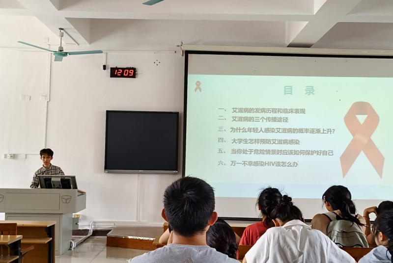 课上,辅导员从艾滋病的发病历程和临床表现、艾滋病的播途径、全球及我国艾滋病的最新信息以及大学生怎样预防艾滋病感染等内容切入,阐述了艾滋病病毒的传播途径及危害,并指出大学生群体不仅是艾滋病传播的高风险人群,同时也是艾滋病预防与控制的实践者,呼吁广大青年学生群体积极参与艾滋病防范学习,了解艾滋病病毒防范举措,做到“要想爱,先懂艾”,做自己健康的第一责任人。