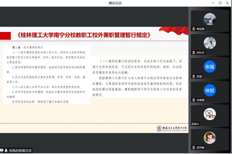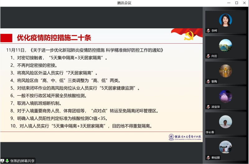 会上,张凯书记领学了《桂林理工大学英国上市公司365教职工校外兼职管理暂行规定》,要求全体教职工严格遵守相关规定。此外,张凯书记详细解读了“优化防控二十条措施”和桂林理工大学英国上市公司365疫情防控倡议书内容,强调要把疫情防控工作落到实处,做好个人防护,筑牢校园安全防线。张凯书记通报了科研申报、学生管理、招生就业等工作情况,针对工作中存在的问题及不足提出整改意见。她鼓励教职工们要围绕分校重点项目开展工作,积极申报科研项目,开动脑筋,群策群力,共同推动系部建设和发展。与会成员就党的二十大精神、《新时代高校教师职业行为十项准则》进行深入学习。