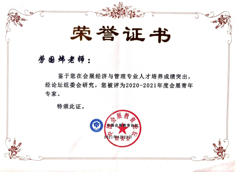 在全国会展教师微课大赛中,分校劳国炜教师的微课参赛作品《会议场景设计》在三十多项作品中脱颖而出,荣获中国会展教育暨第四届全国会展教师微课大赛一等奖,同时,劳国炜老师获评2020-2021年度会展青年专家荣誉称号。