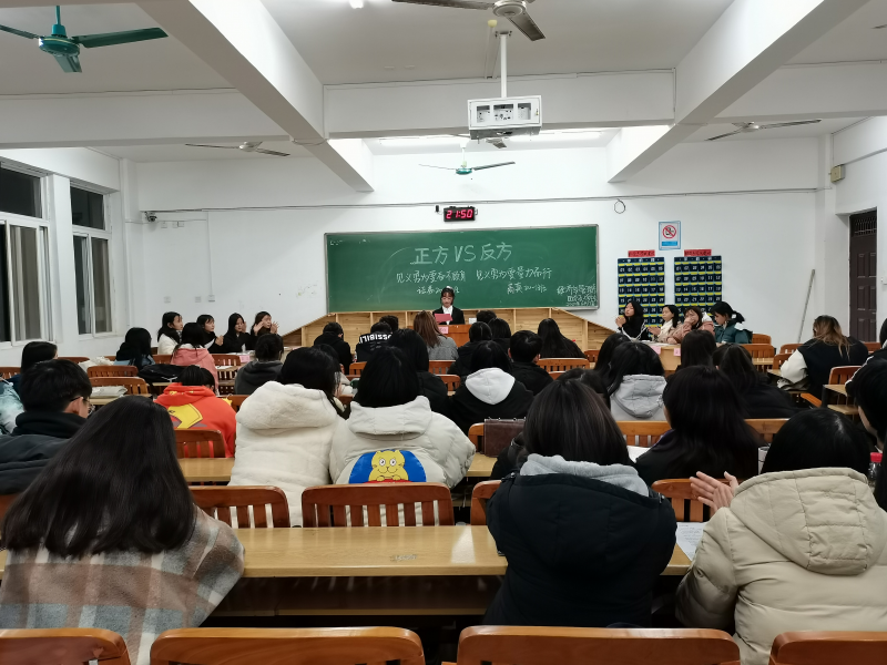 此次对阵的双方分别是:证券20-2班(正方)vs商英20-1班(反方)。双方就“见义勇为要奋不顾身还是量力而行”的论题展开激烈的辩论。从预赛时的崭露头角,到如今的驾轻就熟,比赛过程中,双方辩手们能言善辩,由浅入深,有理有据,不断质疑双方论点。自由辩论环节上,他们辩风犀利,你来我往间,针对对方的陈述漏洞重重攻击,将比赛带入一个又一个的高潮。
