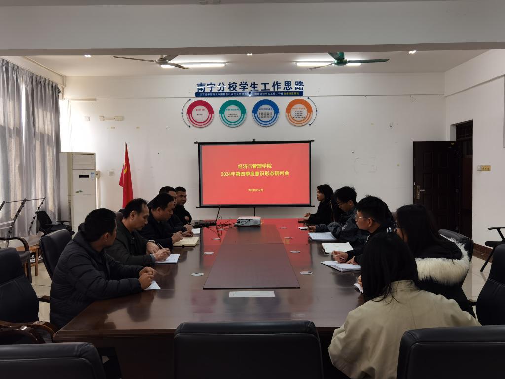 为进一步落实意识形态工作任务,12月24日,经济与管理学院在7205会议室召开第四季度意识形态与安全稳定工作研判会。学院院长周子平、党委书记吕广文、党委副书记兼学工组长方艳东、团委书记陆吉瑞及全体辅导员参加会议。会议由学院党委书记吕广文主持。