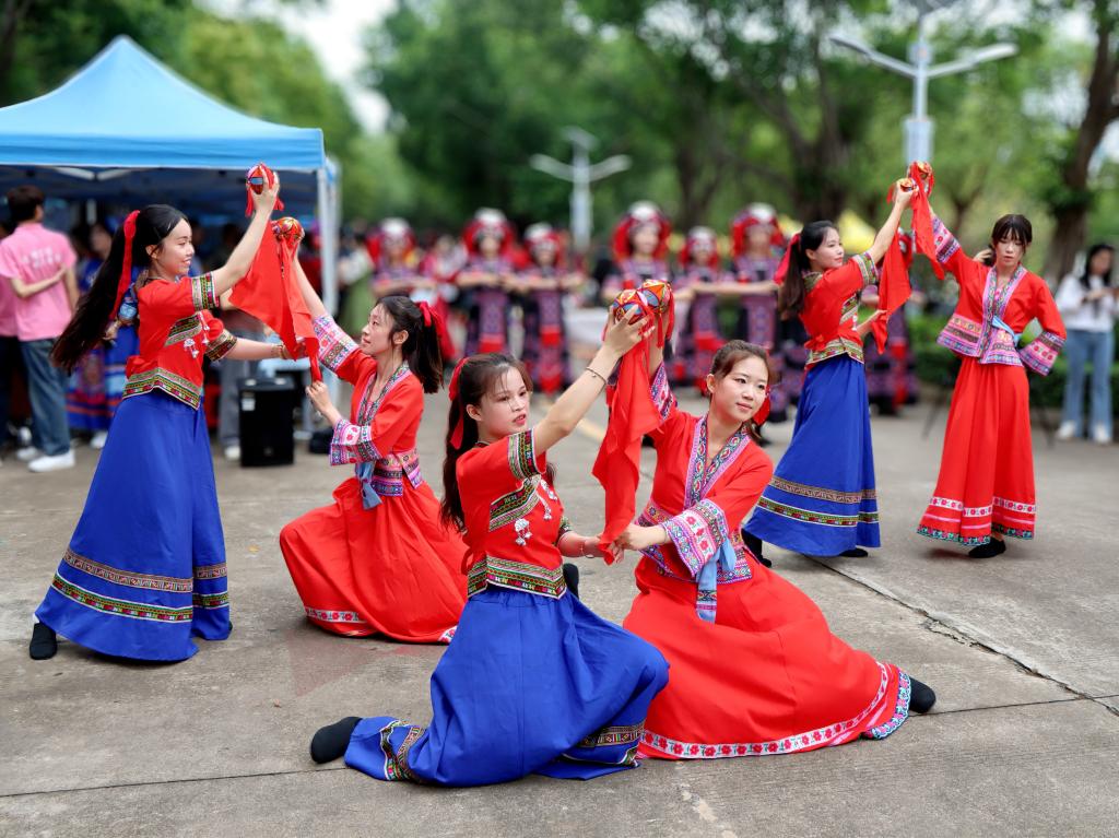 展览会依托会展经济与管理专业,邀请了广西盐业崇左分公司、广西中医药大学附属瑞康医院空港院区(扶绥县中医医院)、扶绥县新华书店、扶绥县民族小学、扶绥县直属机关第三幼儿园等40多家企事业单位参展,系统整合《会展营销》《会展参展实务》《会展参展实训》等专业理论与实践课程开展嵌入式产教融合创新教学实践,围绕民族服饰与织造、民族美食与特产、民族手工艺与文创、民族医药与康养、民族旅游线路推介等主题设置6大特色展区,呈现会展策划、设计、运营等全产业链实践闭环。现场活动形式丰富,通过唱山歌、绣球舞、竹竿舞等非遗展演弘扬优秀民族文化,沉浸式油茶制作、茶艺展演、民族文创体验解码壮乡文化基因密码,非遗诊疗、传统技法体验与现代健康管理深度融合展示壮瑶医药智慧。