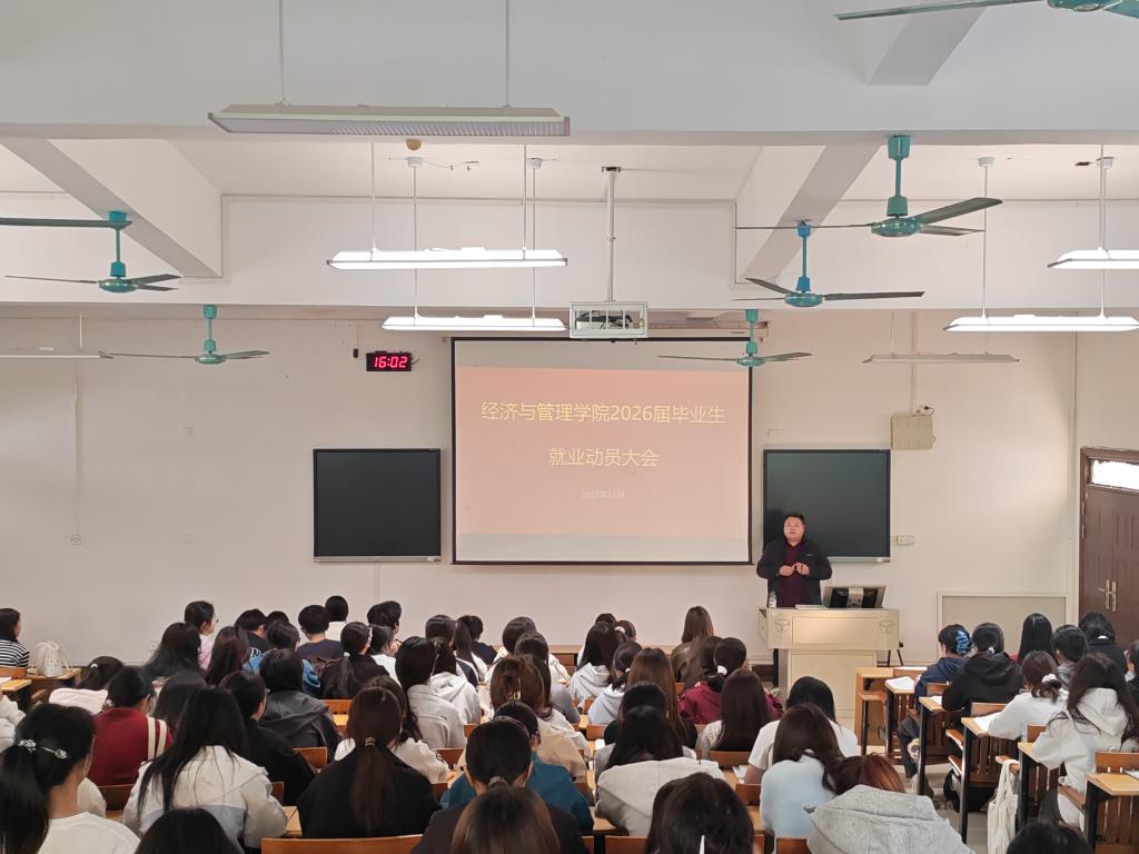 11月25日,经济与管理学院于空港校区启智楼8206教室举行2026届毕业生就业动员大会暨就业指导讲座。学院党委副书记方艳东出席会议并作动员讲话,毕业班全体辅导员及2026届毕业生参加会议。