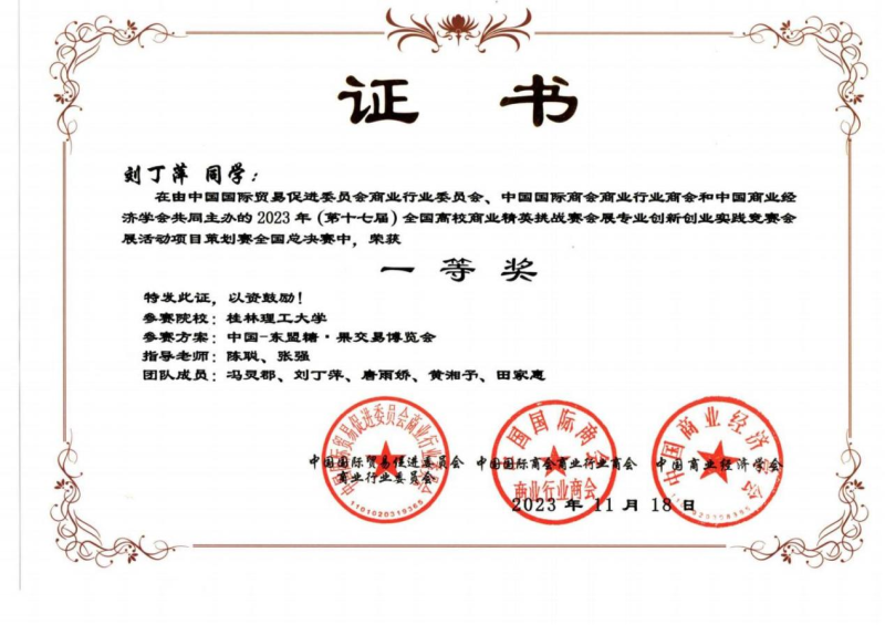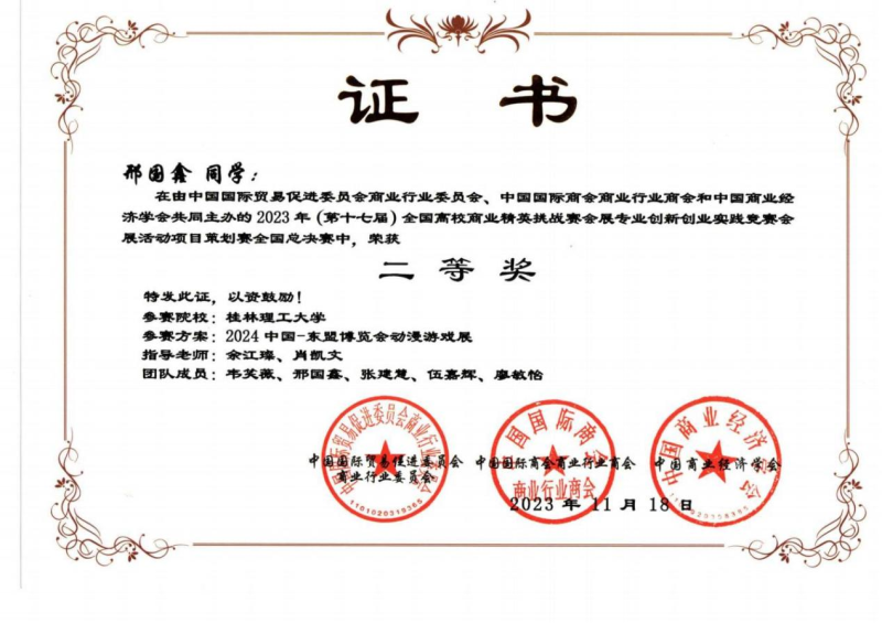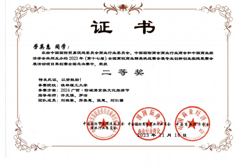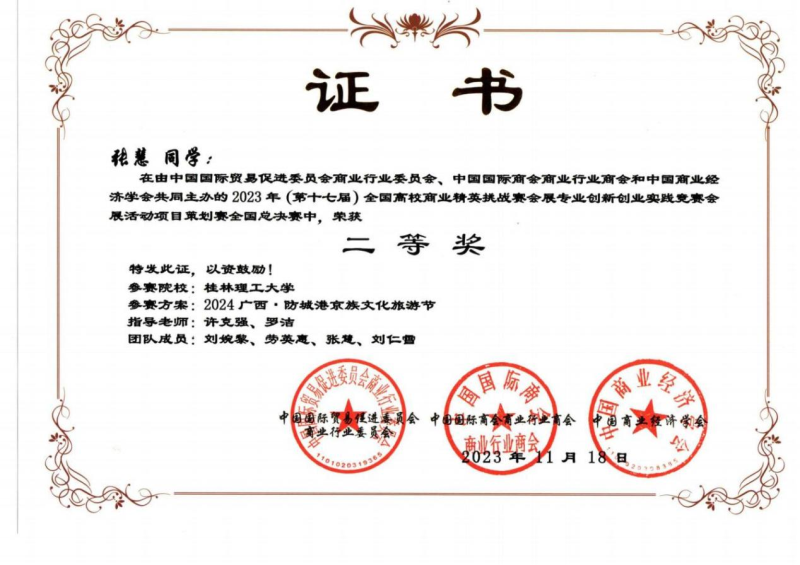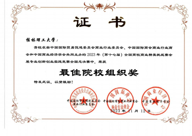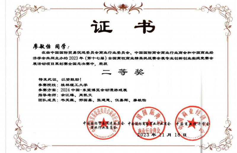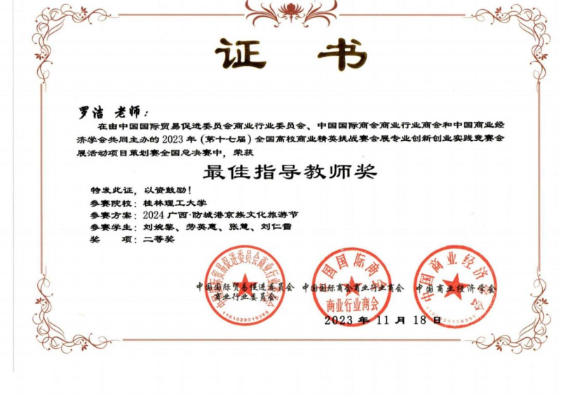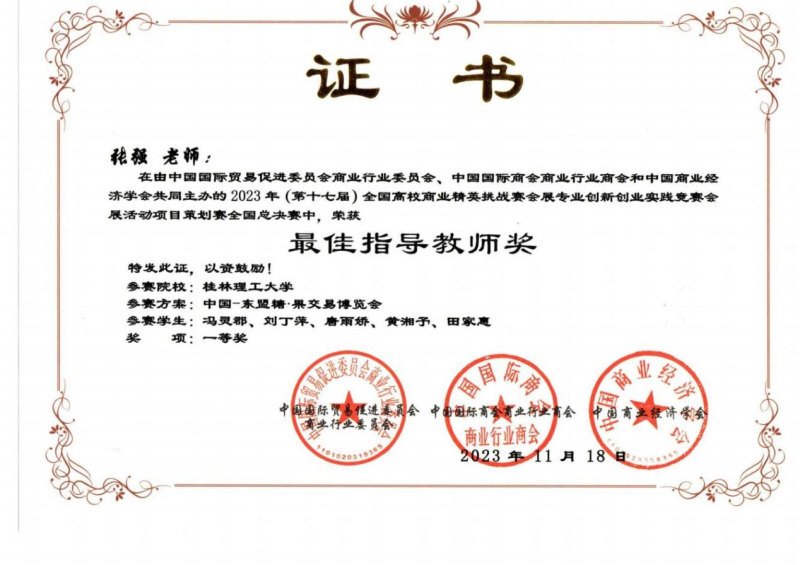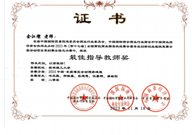 我系陈聪、张强、许克强、罗洁、余江璨、肖凯文老师指导的三支学生参赛队伍经过前期长达2个月的设计策划、展会调研、场馆调研论证、反复修改完善作品,顺利通过初赛进入全国总决赛,最终荣获2023年第十七届全国高校商业精英挑战赛会展创新创业实践竞赛全国总决赛一等奖1项和二等奖2项的优异成绩。陈聪、张强、许克强、罗洁、余江璨、肖凯文老师获得优秀指导老师荣誉称号,此外,桂林理工大学荣获最佳院校组织奖。