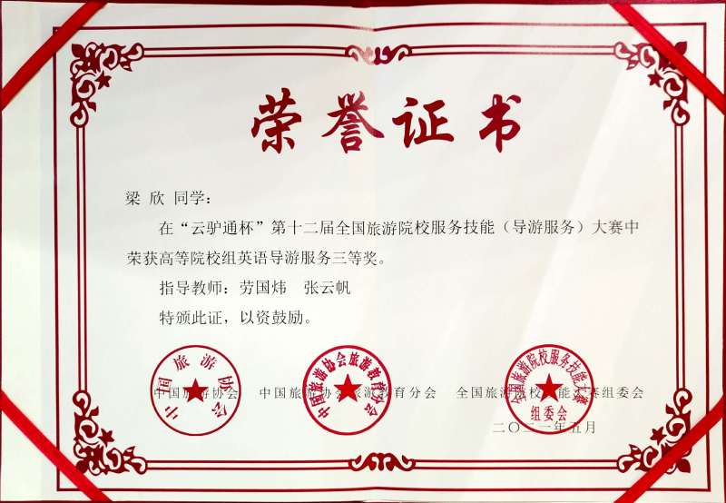第十二届“云驴通杯”全国旅游院校服务技能(导游服务)大赛高等院校组普通话导游服务三等奖