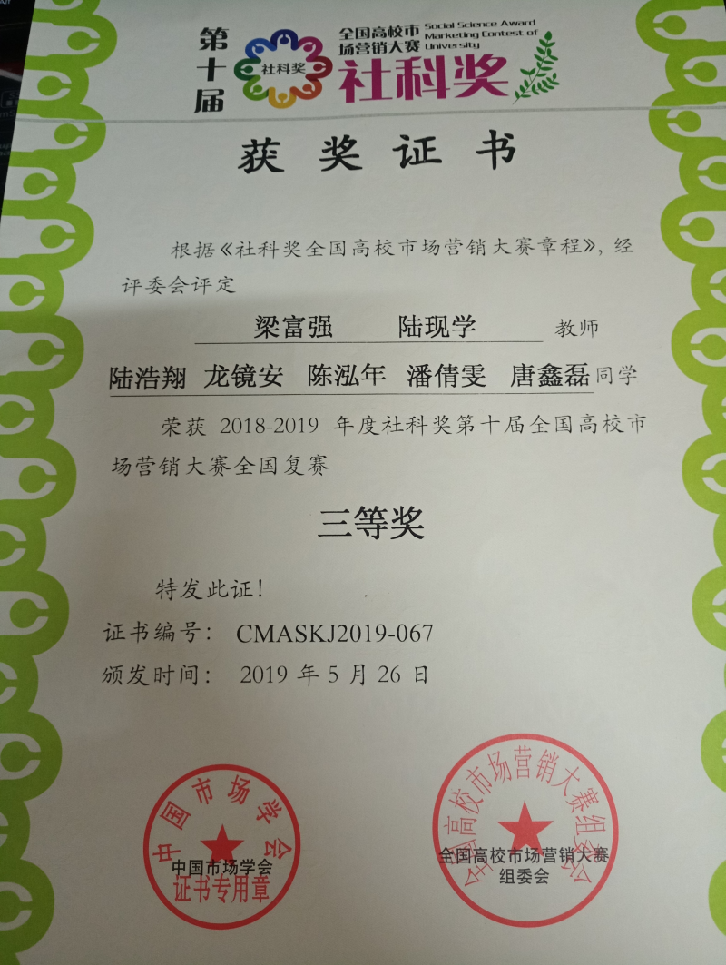 第十届全国高校市场营销大赛全国复赛三等奖