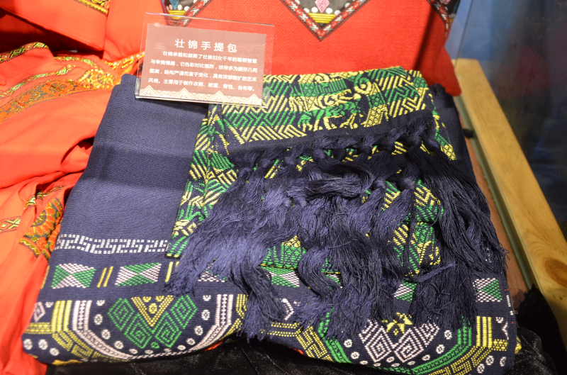 在漫长的历史发展中,壮锦承载和凝聚了壮族妇女千年的聪明智慧与审美情趣,它色彩对比强烈,纹样多为菱形几何图案,结构严谨而富于变化,具有浓郁粗犷的艺术风格。主要用于制作衣裙、被面、背包、台布等。