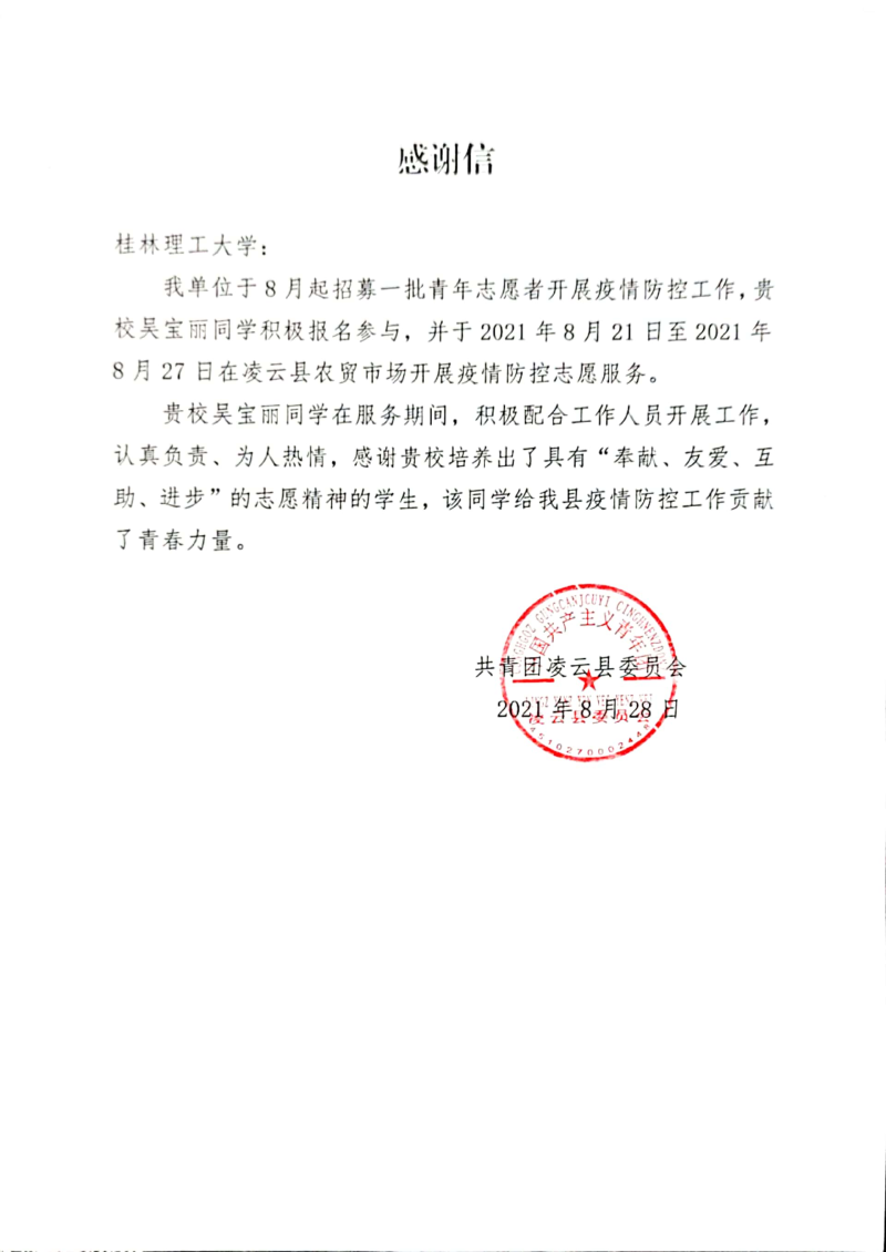 暑假期间,会计学18-2班吴宝丽积极参加凌云县疫情防控志愿者工作,秉承着认真负责的态度,主要负责给进入市场的群众测量体温、提醒群众正确佩戴口罩、检查群众的健康码和行程卡、引导群众申领健康码、科普宣传疫情防控相关知识等情况。