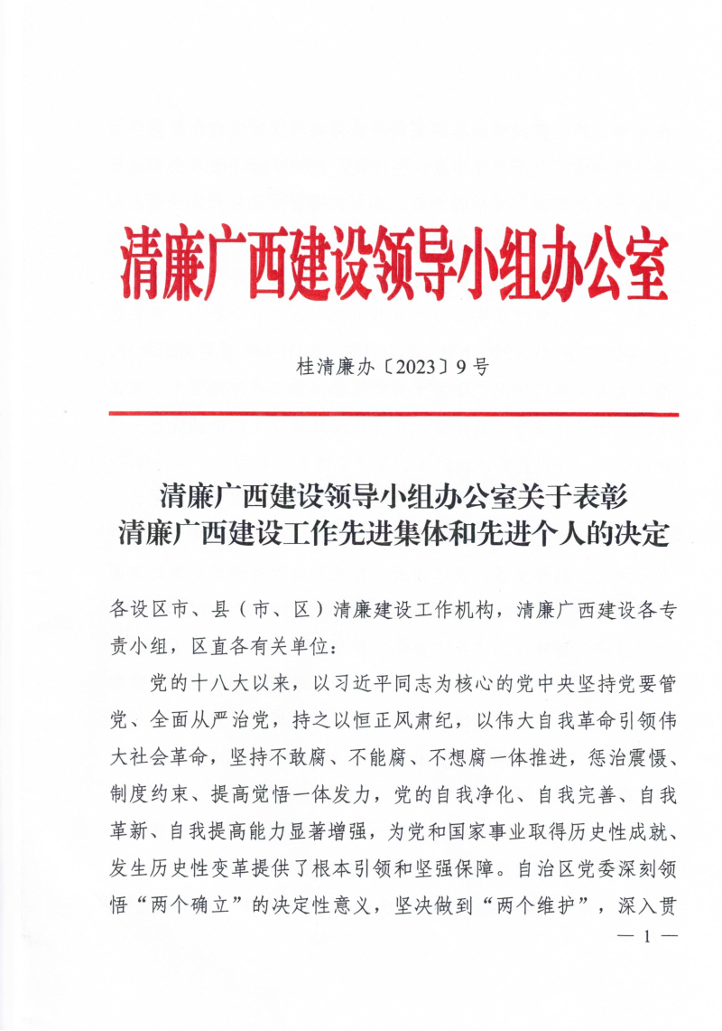 近日,清廉广西建设领导小组办公室发布了《关于表彰清廉广西建设工作先进集体和先进个人的决定》(桂清廉办[2023] 9号),对清廉广西建设工作先进集体和先进个人进行表彰,英国上市公司365荣获清廉广西建设工作“先进集体”称号。